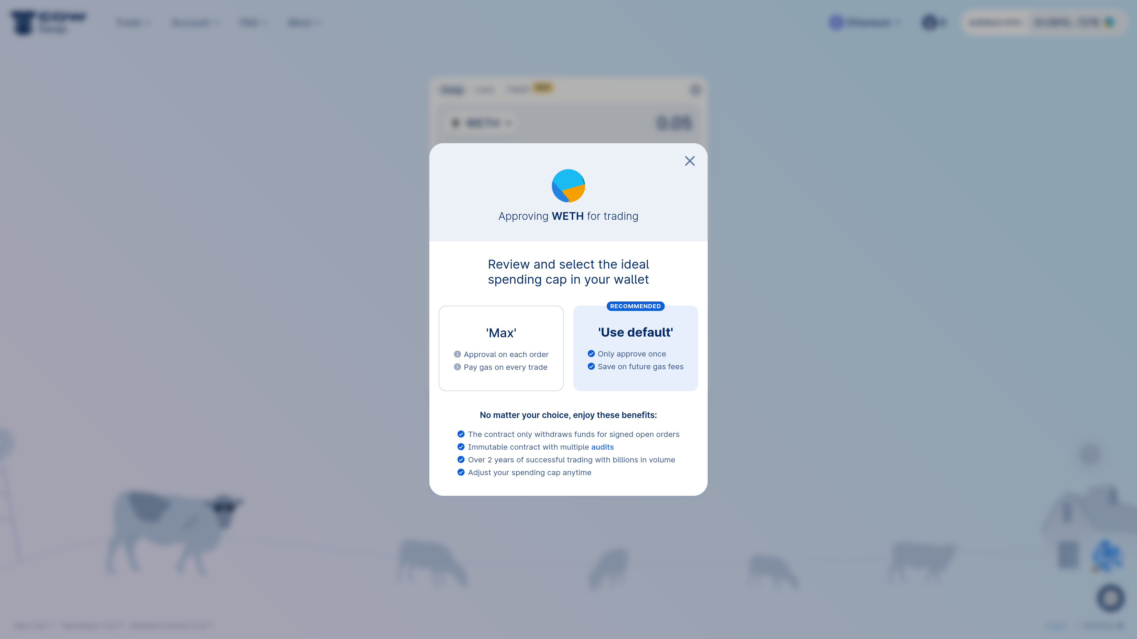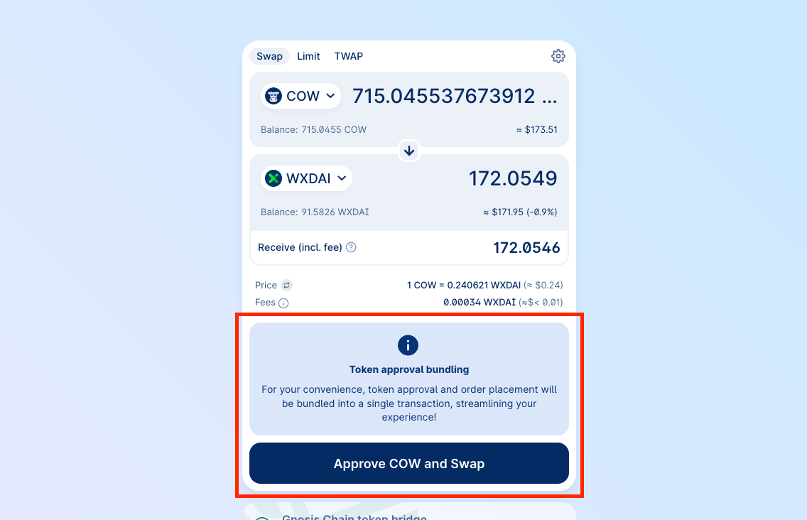 USDC, DAI, COW and many others support gasless approvals. This means that you can approve the vault relayer contract to spend your tokens without having any initial gas for an on-chain transaction. This is a great way to save on gas costs!You don’t have to worry about this, as CoW Swap will automatically detect if the token supports gasless approvals and will guide you through the process.Just look for the gasless approval flag when picking the tokens to get started: