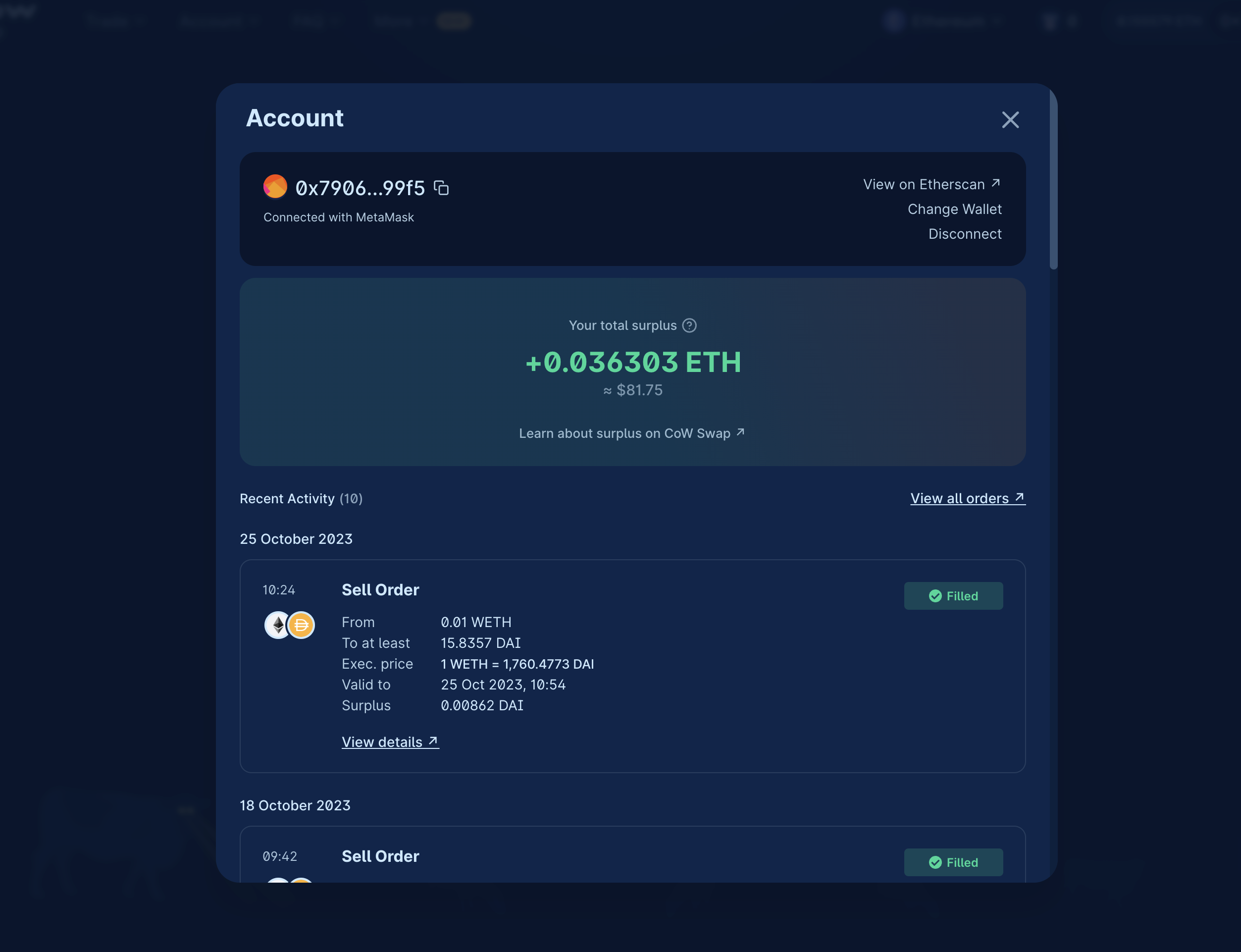Changed your mind? Not a problem! CoW Swap makes it easy and gasless1 to cancel your order. First, open the activity panel by clicking on your address in the top right corner.