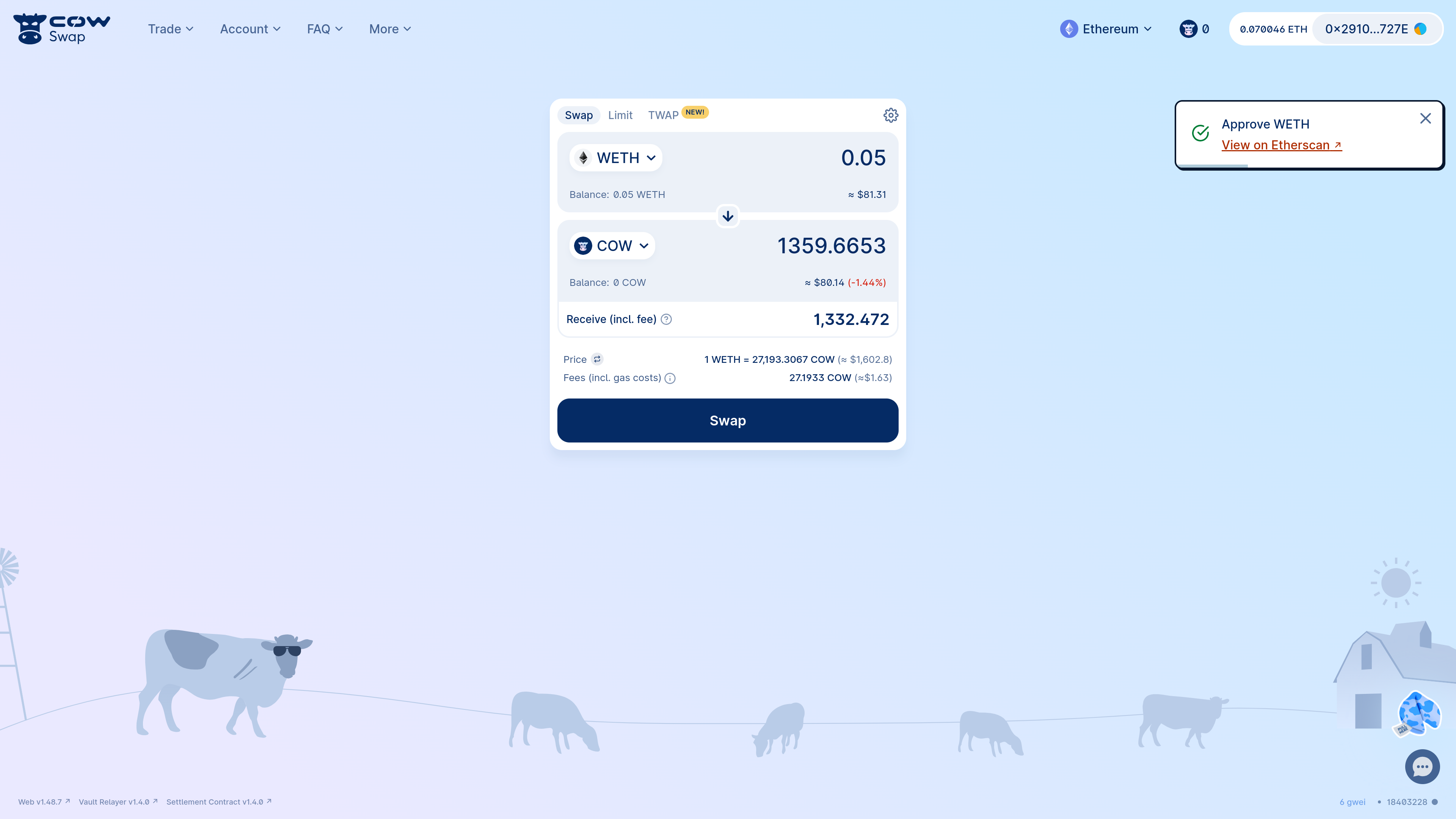 Consider an example swapping 0.05WETH for COW.